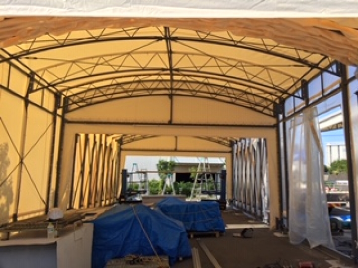 当店では大型のシートハウス、テント倉庫、開閉テントなどであれば500㎡未満までは自社対応が可能です。小型サイズのテントですと、店舗の軒先や日よけテント、デザインテント、装飾テント、オーニング、開閉テント、ビニールカーテンなど全て対応しております。最近では不燃シートを使った防炎垂れ壁などのご依頼も頂くようになり、ビニール・シート・テントなどの生地を使った加工などは対応可能ですので、お気軽にお問合せ下さいませ。