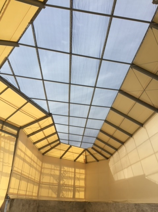 静岡県富士市にてH鋼の立ち上がりにテント生地で仕切テント工事を施工致しました。