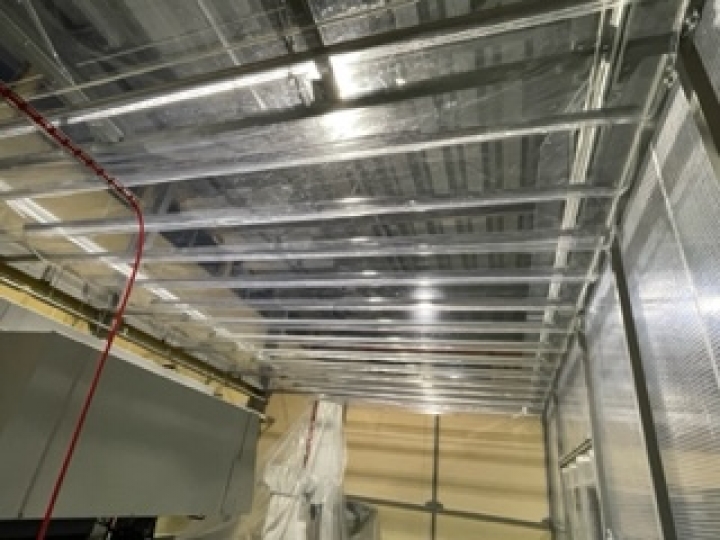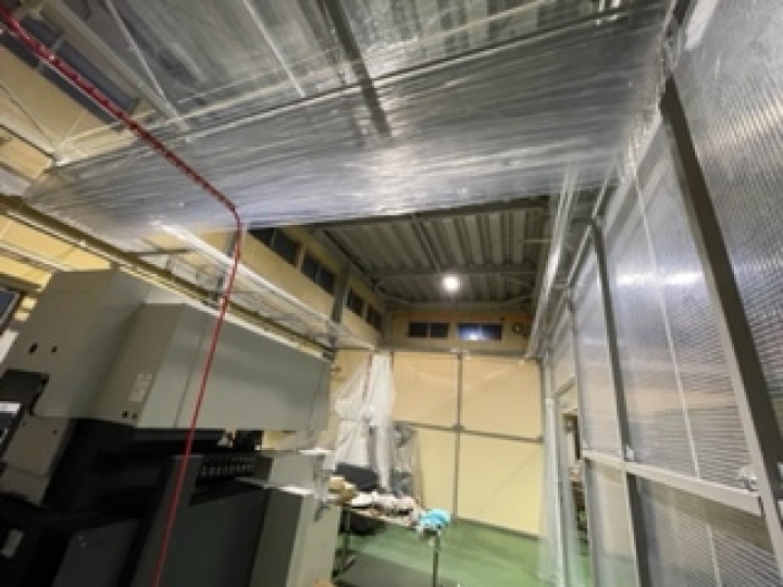 お話をお伺いする中で通常の固定天井では対応出来ない為(作業性において)材料搬入するエリアを開閉式(手動ロープ)で対応製作させて頂きました。