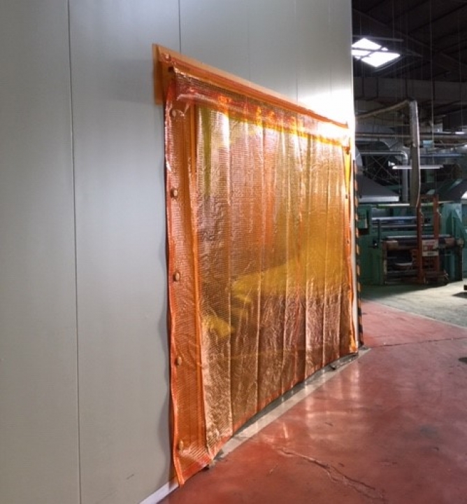 既存シートはアコーディオンカーテンでしたが、フレーム破損等で開閉がスムーズにいかず、作業性も悪く風対策、防虫対策の為、張替え、台車通貨の為、左側にレールを300伸ばしてカーテン開閉時の戸袋確保致しました。