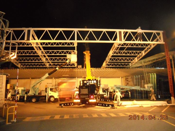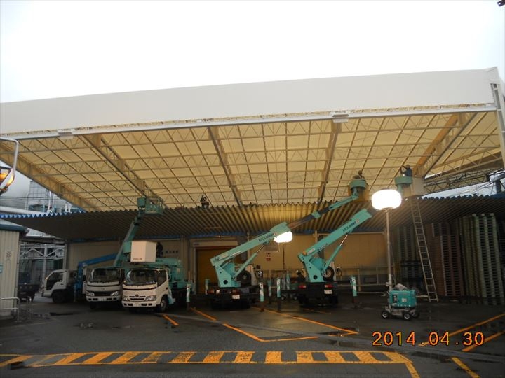 大型トラックへの荷物の積み下ろしなどが頻繁にあるため、工場定休日に終日作業で実施。柱などは荷捌き場内には立てれないため、既存建物を活かした施工方法と設計にて施工を行いました。