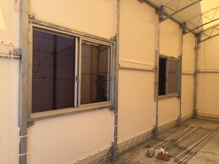 オプションとして窓サッシ4か所 電動換気扇1台、出入口は軽量シャッター庇も大きめに(通常より)基礎スロープなど色々な場面に対応施工致します。