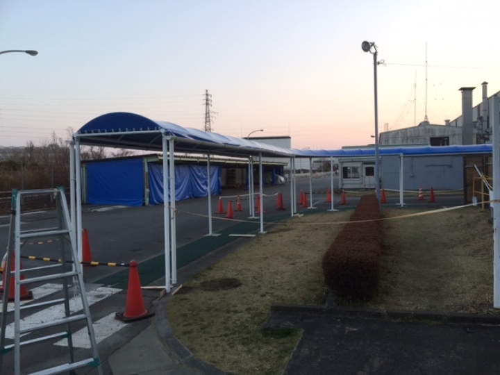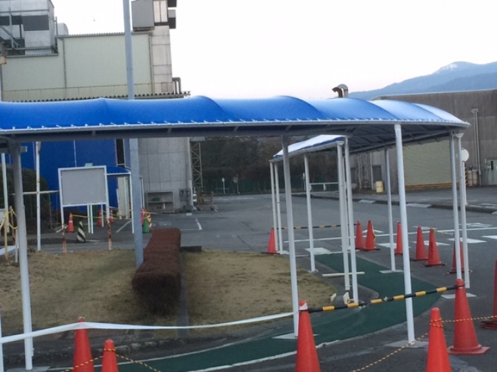 既存建屋との取り合い(オーバーラップ庇)直線だけではなく道路に合わせコーナーテントも無事、納まりました。